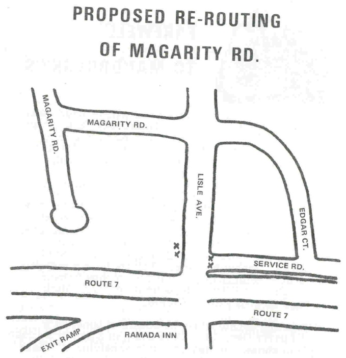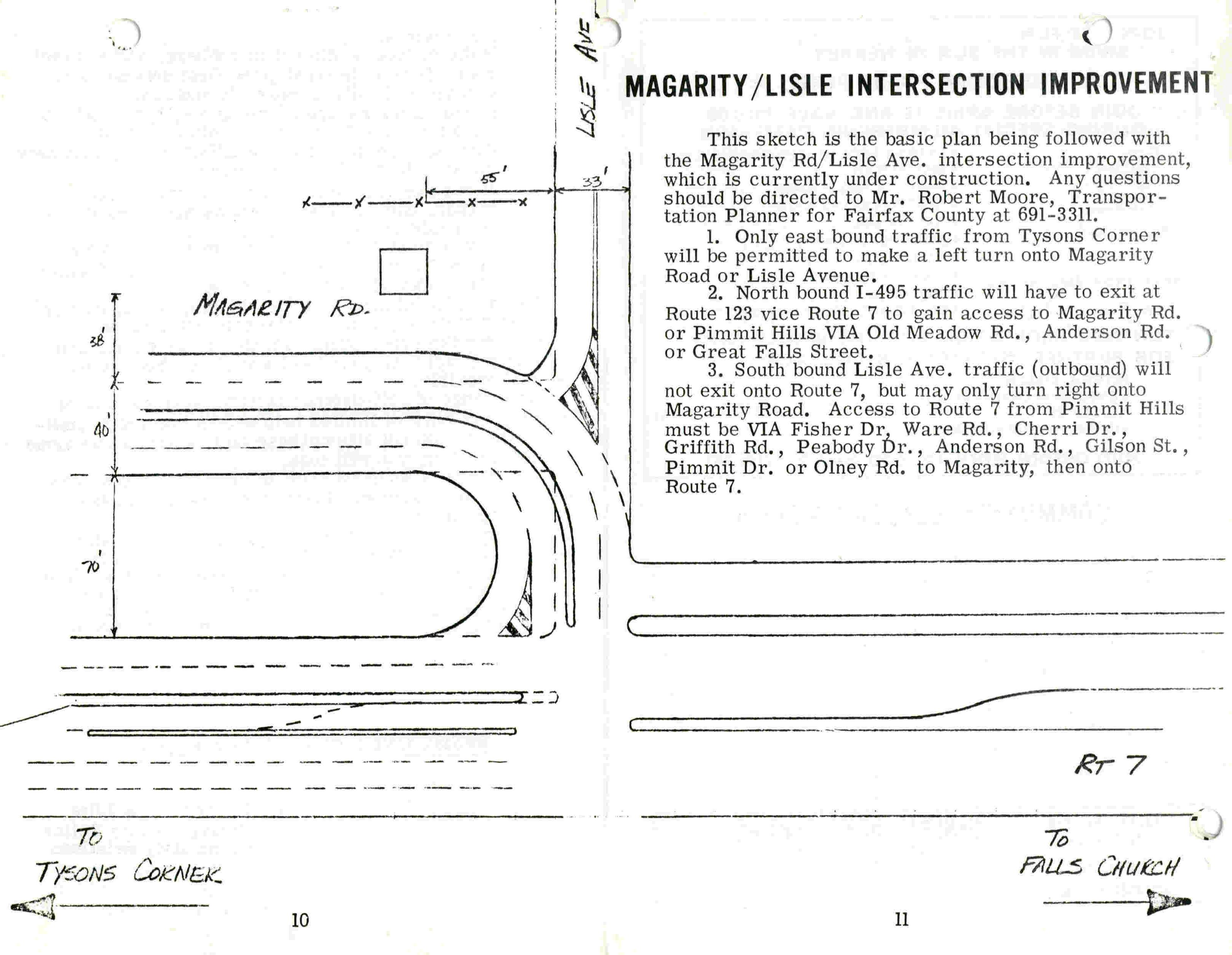 At the January 1975 PHCA meeting, Fairfax County planning staff presented VDOT plans for the re-routing of Magarity Road/Route 7/Lisle Avenue intersection. Here was their proposed plan:
